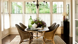 Sheer cafe curtains, hung just above the bottom sash, give the dining room softness and privacy while still allowing a view of the outside and inviting lots of sunlight to stream in through the upper panes.