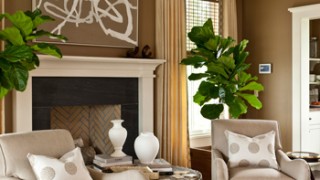 In the second-floor suite, Phoebe gave the small space big impact by covering everything in the same fabric. On the first floor, rich brown walls and a combination of neutral fabrics carry out a warm mushroom-and-ivory color palette.